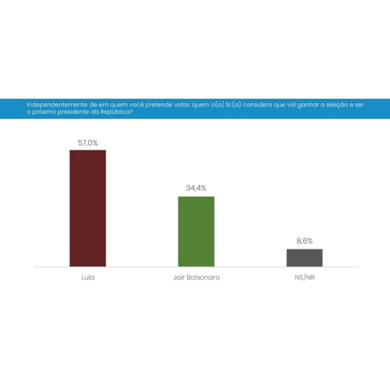Por outro lado, 34,4% disseram acreditar na virada do presidente Jair Bolsonaro (PL) no segundo turno, enquanto 8,6% não souberam ou não responderam. O levantamento também apontou que 91,9% dos entrevistados “com certeza” vão votar.
