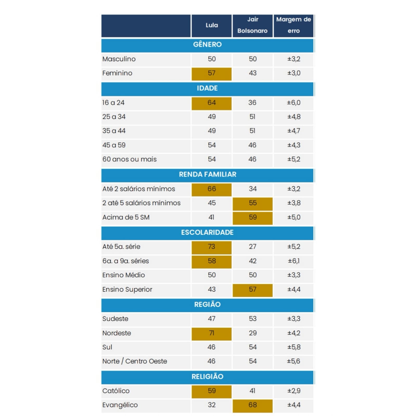 No caso de escolaridade, Lula é o líder entre quem cursou até a 5ª série (73% a 27%) e da 6ª à 9ª série (58% a 42%). Já Bolsonaro lidera entre os que têm ensino superior (57% a 43%), sendo que há empate numérico entre os que têm ensino médio.