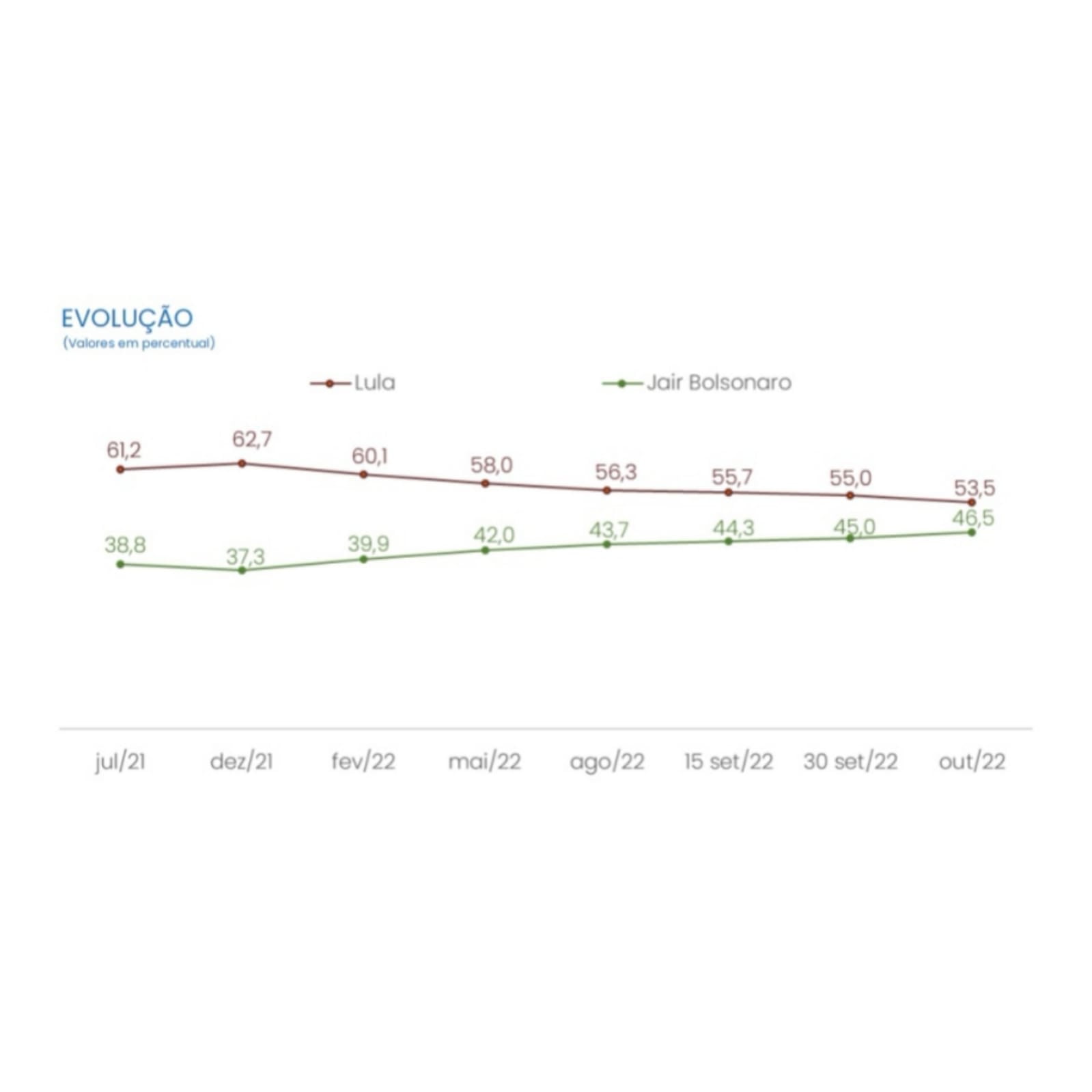 Em relação aos números sobre rejeição, Bolsonaro aparece à frente, com 50,1%. Lula, por sua vez, é rejeitado por 44,4%. No caso de votos consolidados, 95,1% dos que apoiam o presidente afirmaram que não há chance de mudar de posição. O petista, nesse ponto, atinge 94,2%.