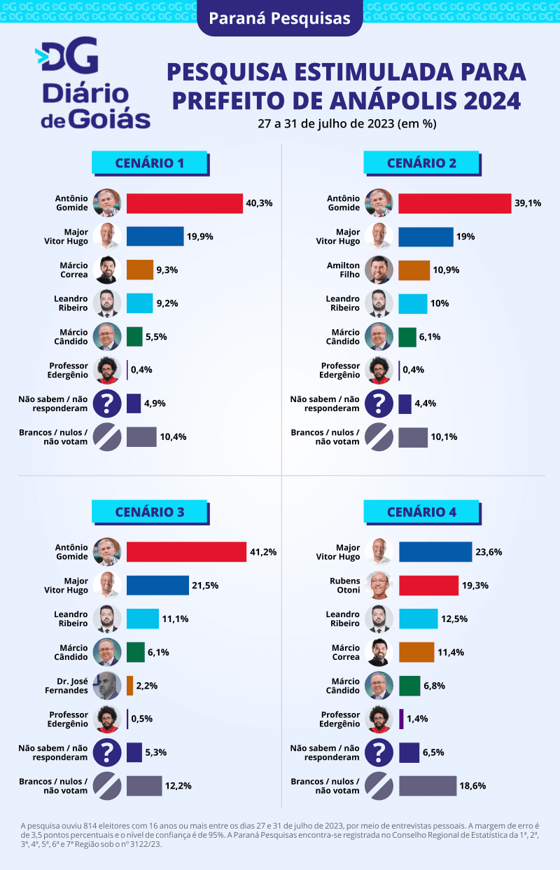 Já no terceiro cenário, Antônio Gomide aparece com 41,2%. Em segundo lugar, Major Vitor Hugo tem 21,5%, seguido por Leandro Ribeiro, com 11,1% e Márcio Cândido com 6,1%. Incluído nesta projeção, o vereador Dr. José Fernandes (MDB) tem 2,2% e Professor Edergênio tem 0,5%. Não sabem ou não responderam 5,3%. Pessoas que afirmam votar branco, nulo ou que não votam são 12,2%.