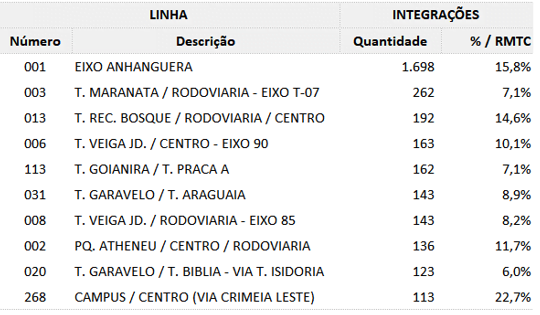 Além do Eixo Anhanguera, outras linhas registraram números expressivos de validação pelo Bilhete Único. O segundo lugar ficou com a linha 003 – Terminal Maranata/Rodoviária-Eixo-T-07, com 262. Aparecem ainda a linha 013 – Term. Recanto do Bosque / Rodoviária / Centro, com 192 embarques; e linha 006 – Term. Veiga Jardim / Centro – Eixo 90, com 163 validações.