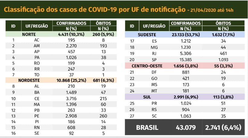 O total de casos no país é de 43.079, com acréscimo de 2.498 em relação a segunda-feira. O aumento é de 6,1%. A taxa de letalidade é de 6,4%.