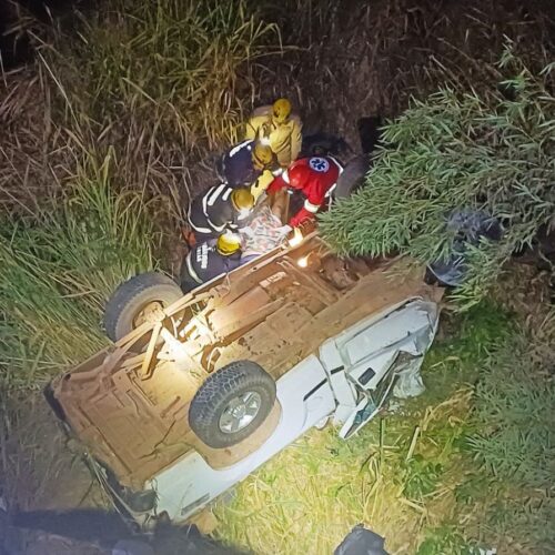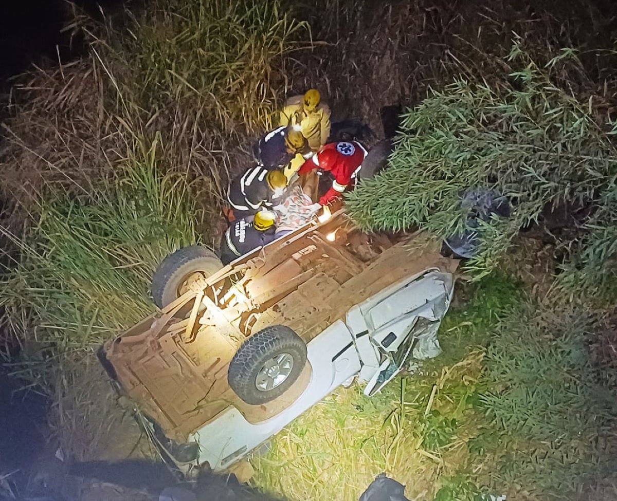 Carga cai de caminhão e faz veículo desgovernar, ficando de rodas para cima e ferindo casal
