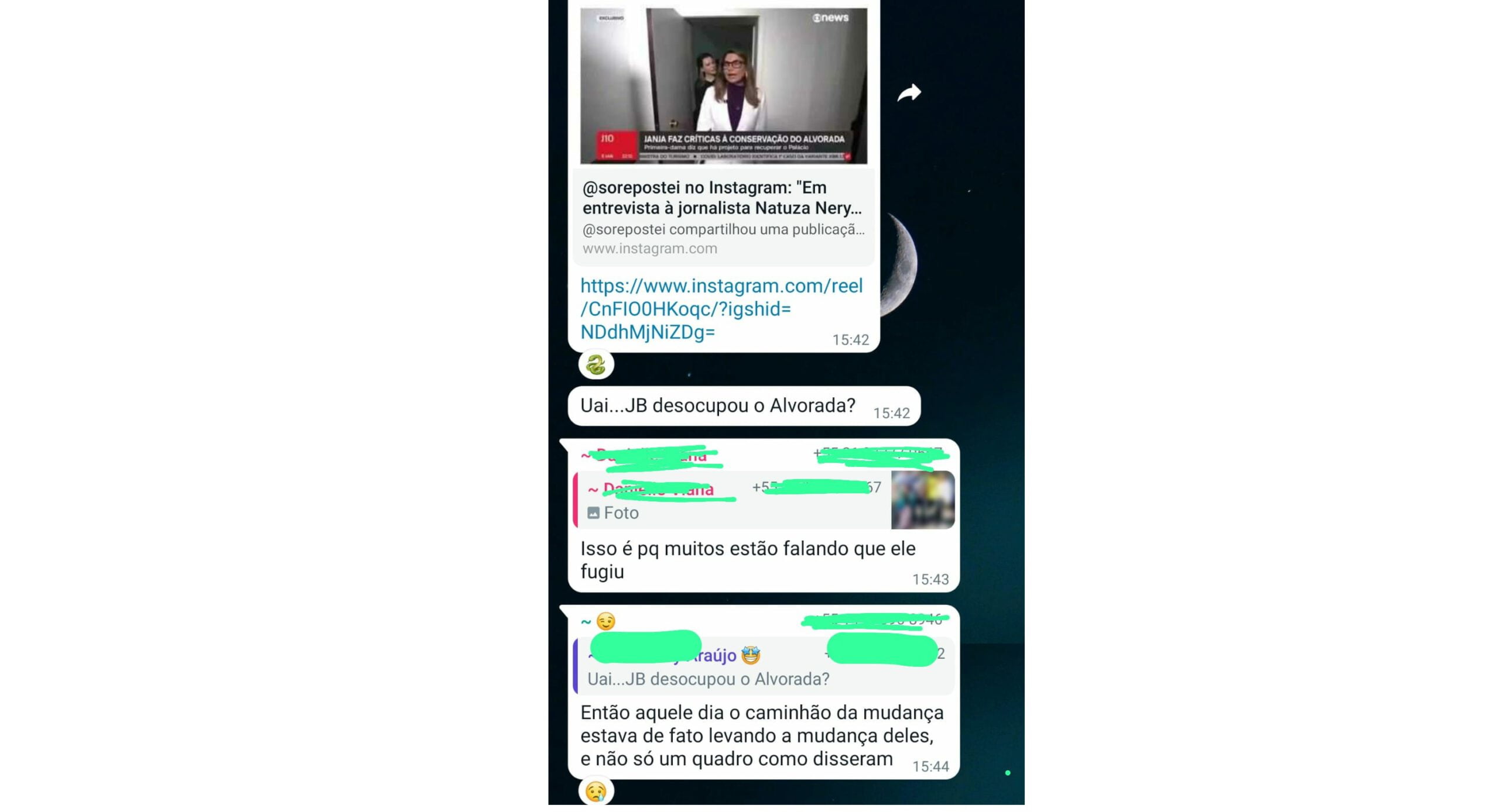 “Uai, JB desocupou o Alvorada?”, indagou um bolsonarista em um grupo bolsonarista no Whatsapp, que este jornalista que vos escreve está silenciosamente infiltrado. “Então aquele dia o caminhão da mudança estava de fato levando a mudança deles, e não só um quadro como disseram”, respondeu. “Está tudo muito complexo”, disse outro tentando conter os ânimos. “A verdade logo vem à tona, no mais, ficamos especulando”.