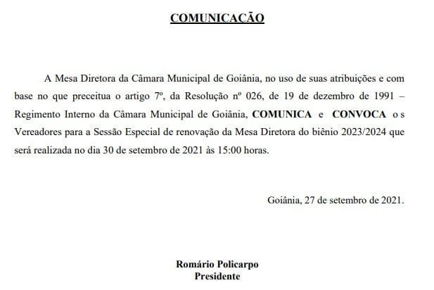 Em meio ao debate em torno do novo Código Tributário de Goiânia, o presidente da Câmara dos Vereadores, Romário Policarpo (PATRI) marcou para quinta-feira (30/09) às 15 horas a antecipação da eleição da Mesa Diretora da Casa para o biênio 2023/2024. A publicação no Diário Oficial da Prefeitura aconteceu nesta terça-feira (28/09).
