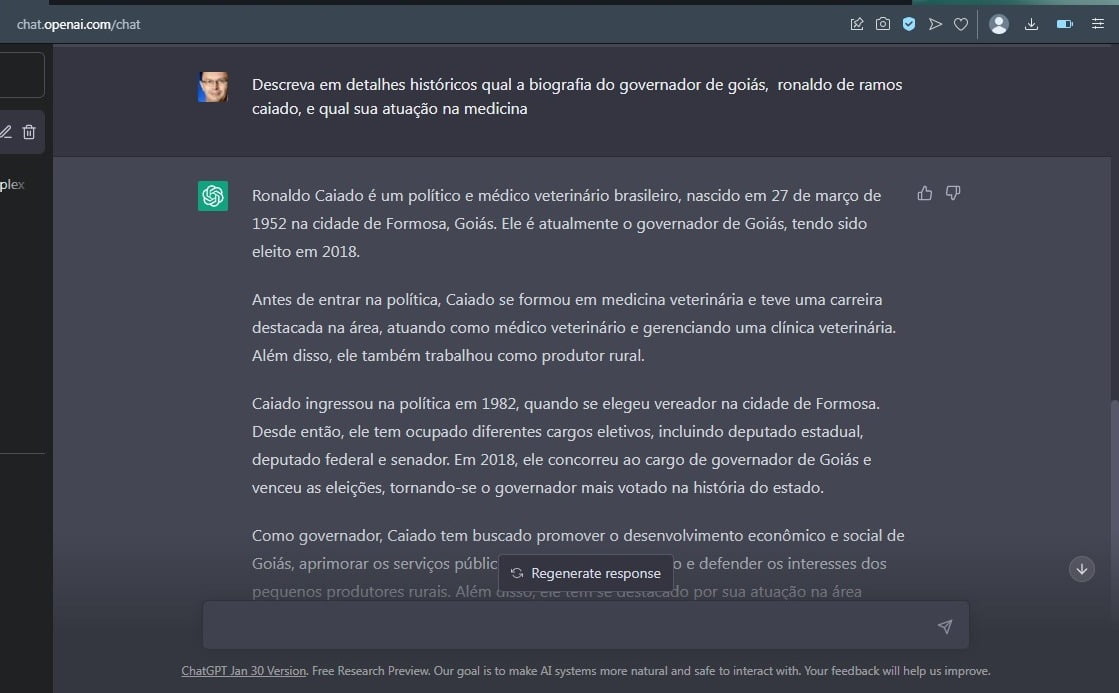 A inteligência artificial está a caminho de ser amplamente utilizada em diversas atividades, mas é preciso ter cuidado com o resultado que é conseguido. Ao badalado ChatGPT, o blog pediu que fosse elaborada uma biografia do governador de Goiás, Ronaldo Caiado. O resultado da resposta conseguida cometeu dois erros: Na formação profissional e no local de nascimento do político.