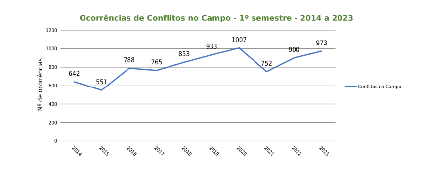 A Comissão Pastoral da Terra (CPT) divulgou, nesta terça-feira (10), os dados de conflitos no campo referentes ao 1º semestre de 2023. Ao todo, foram registrados 973 conflitos no campo, representando um aumento de 8% em relação ao mesmo período de 2022, quando foram registrados 900 conflitos. Os dados foram coletados, organizados e registrados pelo Centro de Documentação Dom Tomás Balduíno (Cedoc).