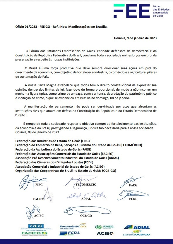A nota foi assinada pelas federações das Indústrias (FIEG), do Comércio de Bens, Serviços e Turismo (FECOMÉRCIO), da Agricultura (FAEG), das Associações Comerciais (FACIEG) e das Câmaras dos Dirigentes Lojistas (FCDL), além da Organização das Cooperativas do Brasil (OCB-GO) e das associações Pró Desenvolvimento Industrial (ADIAL) e Comercial e Industrial (ACIEG).