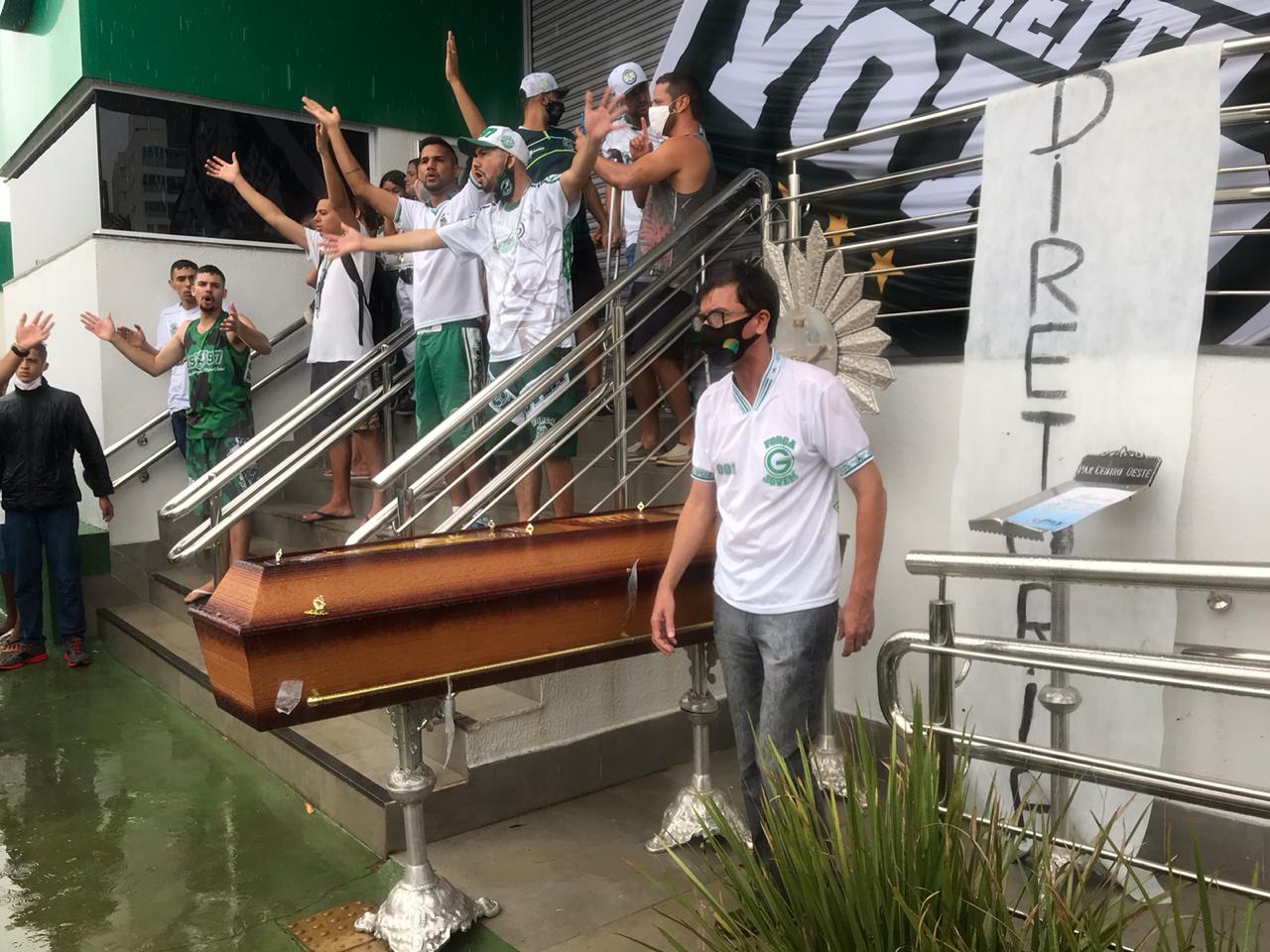 Carro de funerária e caixão em protesto de torcedores no Goiás