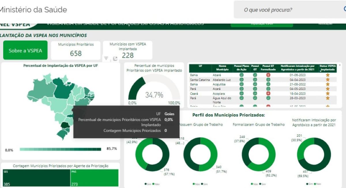 No Brasil, de 658 municípios considerados prioritários pelo nível de exposição a agrotóxicos, somente 228 (34,7%) têm o programa implantado, e nenhum fica em Goiás. O dado está no painel virtual do programa, criado em 2022, disponibilizado e atualizado pelo ministério.