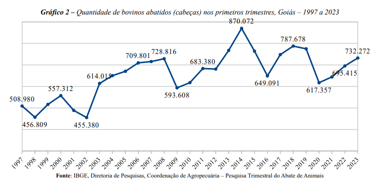 De acordo com o levantamento do Instituto Brasileiro de Geografia e Estatística (IBGE), nessa análise por primeiros trimestres, a pesquisa mostra o terceiro aumento consecutivo, após duas quedas em 2019 e 2020. No Brasil, o abate de bovinos chegou a 7,3 milhões de cabeças e continua a subir no primeiro trimestre de 2023.