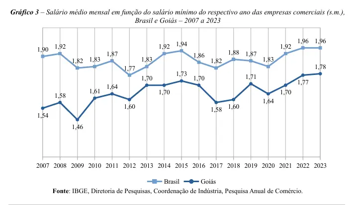 Apesar da geração de empregos, o salário médio mensal pago pelo comércio goiano foi de R$ 2.342,25, equivalente a 1,78 salário mínimo, também o maior já registrado no Estado. No entanto, o valor continua abaixo da média nacional, que foi de R$ 2.572,49 no mesmo período. Essa diferença salarial tem se mantido desde o início da série histórica, evidenciando um descompasso entre crescimento do setor e valorização da mão de obra em Goiás.