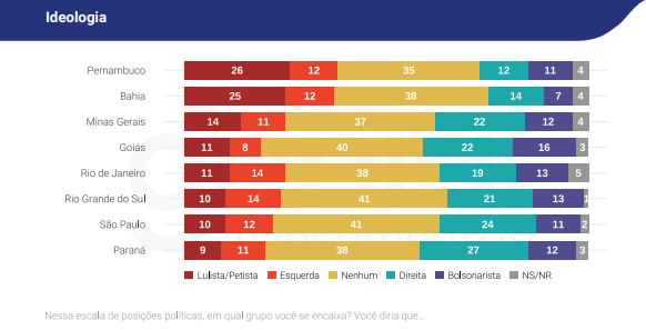 Já em São Paulo, a direita (24%) e o bolsonarismo (11%) se destacam, enquanto a esquerda representa 22% (10% lulistas e 12% esquerda). Aqui, os que não se alinham a nenhuma ideologia somam 41%, o maior índice entre os Estados analisados. E o Paraná apresenta um dos menores índices de identificação com a esquerda (9% lulistas e 11% esquerda), enquanto a direita e o bolsonarismo somam juntos 39% dos eleitores. Ainda assim, 38% dos paranaenses evitam se identificar com qualquer espectro político.