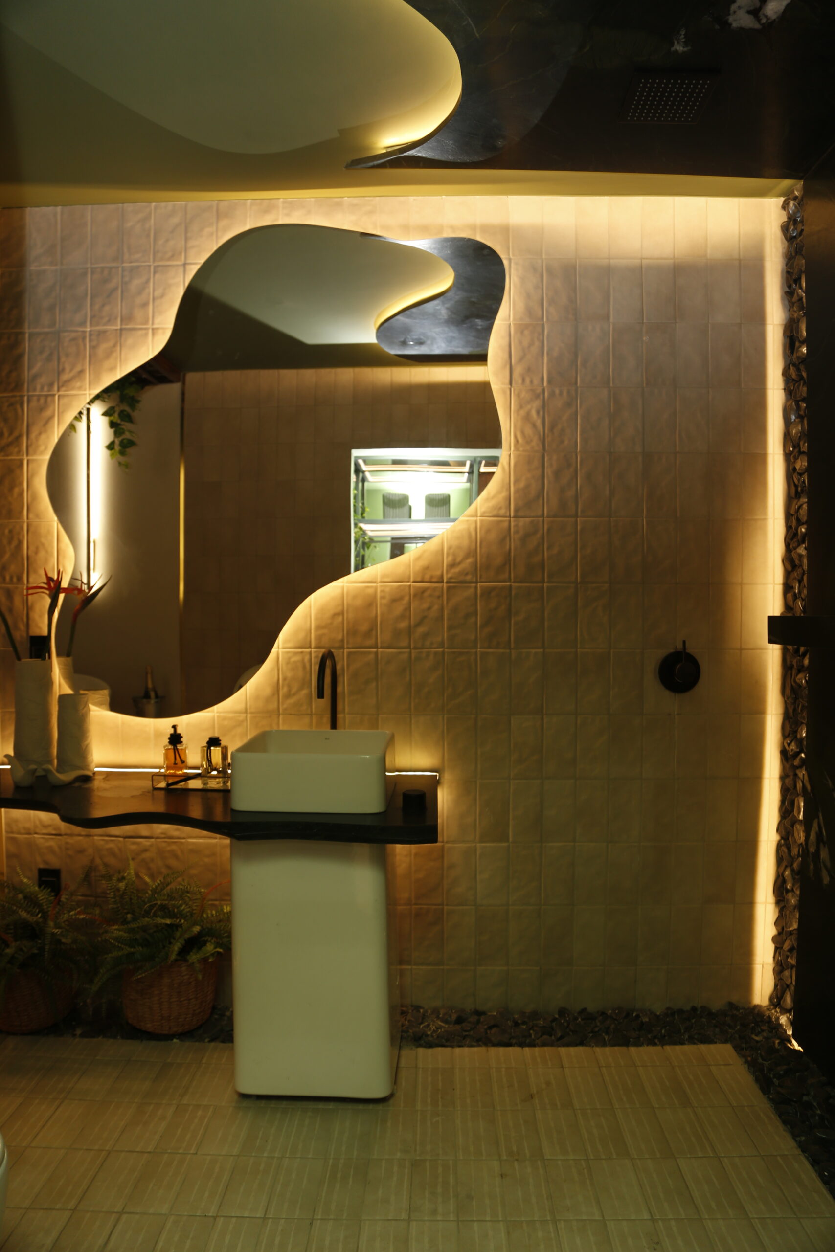 Os ambientes também exploram a espiritualidade e temas voltados para a saúde mental. O ambiente Cubo de Metatron é exemplo dessa tendência, concebido pela arquiteta Dani Costa. Seu objetivo é que o local seja um convite para que os visitantes busquem sua espiritualidade. A arquiteta trouxe uma jabuticabeira suspensa para ser o elemento central do espaço. Sob a árvore está o elemento sagrado Cubo de Metatron, utilizado há séculos para meditação. “É um convite para reflexão em busca de cura das emoções e paz interior”, diz.