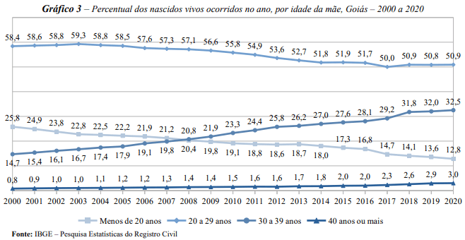 A partir de 2010 há diminuição relativa dos nascimentos cujas mães pertenciam a essa faixa etária. Por outro lado, aumentam as mães goianas que têm seus primeiros filhos entre 30 a 39 anos (23,3% do total). Em 2020, a participação dos grupos de 20 a 29 anos de idade é inferior a 51% dos nascimentos ocorridos e registrados.