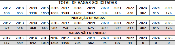 Confira, abaixo, o número detalhado de vagas solicitadas nos últimos anos: