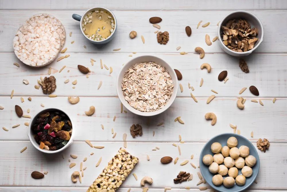 As fibras estão associadas a maior saciedade e ajudam a tornar a resposta do corpo aos carboidratos mais “suave”. Instituições como a American Heart Association destacam frutas, vegetais, grãos integrais, leguminosas, sementes e oleaginosas como fontes importantes.