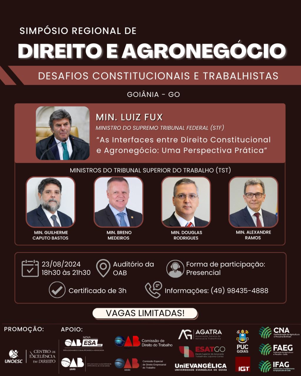 Com o tema “Desafios Constitucionais e Trabalhistas”, o simpósio se propõe a discutir questões importantes que afetam diretamente a relação entre o Direito e o agronegócio. Entre as presenças confirmadas, está o ministro do Superior Tribunal de Justiça (STJ), Luiz Fux, que participará enriquecendo ainda mais os debates com sua vasta experiência e conhecimento jurídico.