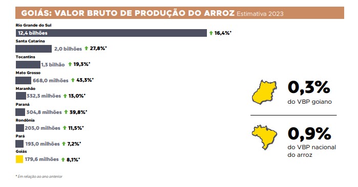 No ranking nacional, Goiás tem posição distante dos líderes de produção do arroz, pois no Estado, o cultivo de soja e milho dominam o mercado goiano. Assim sendo, a estimativa para o valor bruto de produção do arroz para 2023 é de 12,4 bilhões no Rio Grande do Sul, maior produtor nacional; 2,0 bilhões em Santa Catarina, o segundo; 1,3 bilhões em Tocantins, o terceiro; 668 milhões no Mato Grosso, que assume a quarta posição; e 332,3 milhões no Maranhão, no quinto lugar. Goiás assume a 10ª posição, com 179,6 milhões.