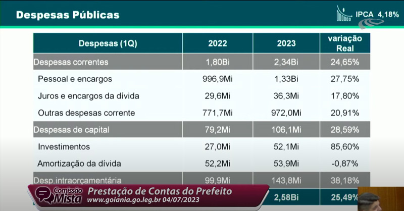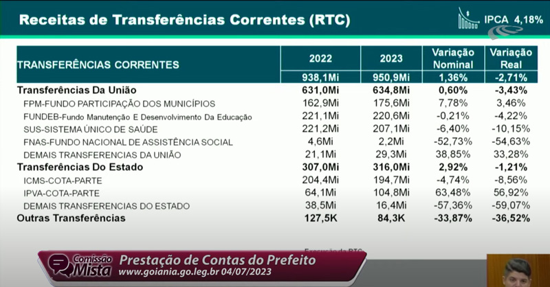 Coube ao titular da Sefin detalhar ao Legislativo as informações sobre receitas e despesas. A partir de um comparativo do período, Vinicius disse que a arrecadação em Goiânia no ano de 2022 foi de R$ 2,45 bilhões. Em 2023 esse valor foi de R$ 2,55 bilhões, um crescimento de 1,26%.