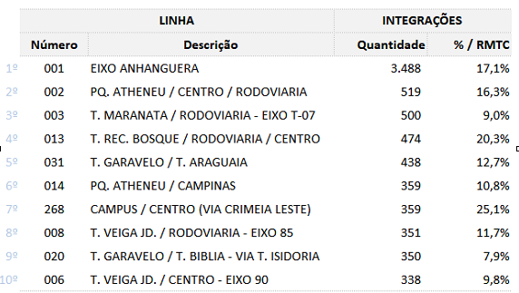 O Eixo Anhanguera continua na liderança do ranking das 10 maiores linhas com integrações via Bilhete Único nesta terça-feira (5), com 3.488 embarques. Em seguida está a linha 002 – Parque Atheneu/Centro/Rodoviária, com 519 embarques integrados; e a linha 003 – Terminal Maranata/Rodoviária/Eixo T-7, com 500 validações.