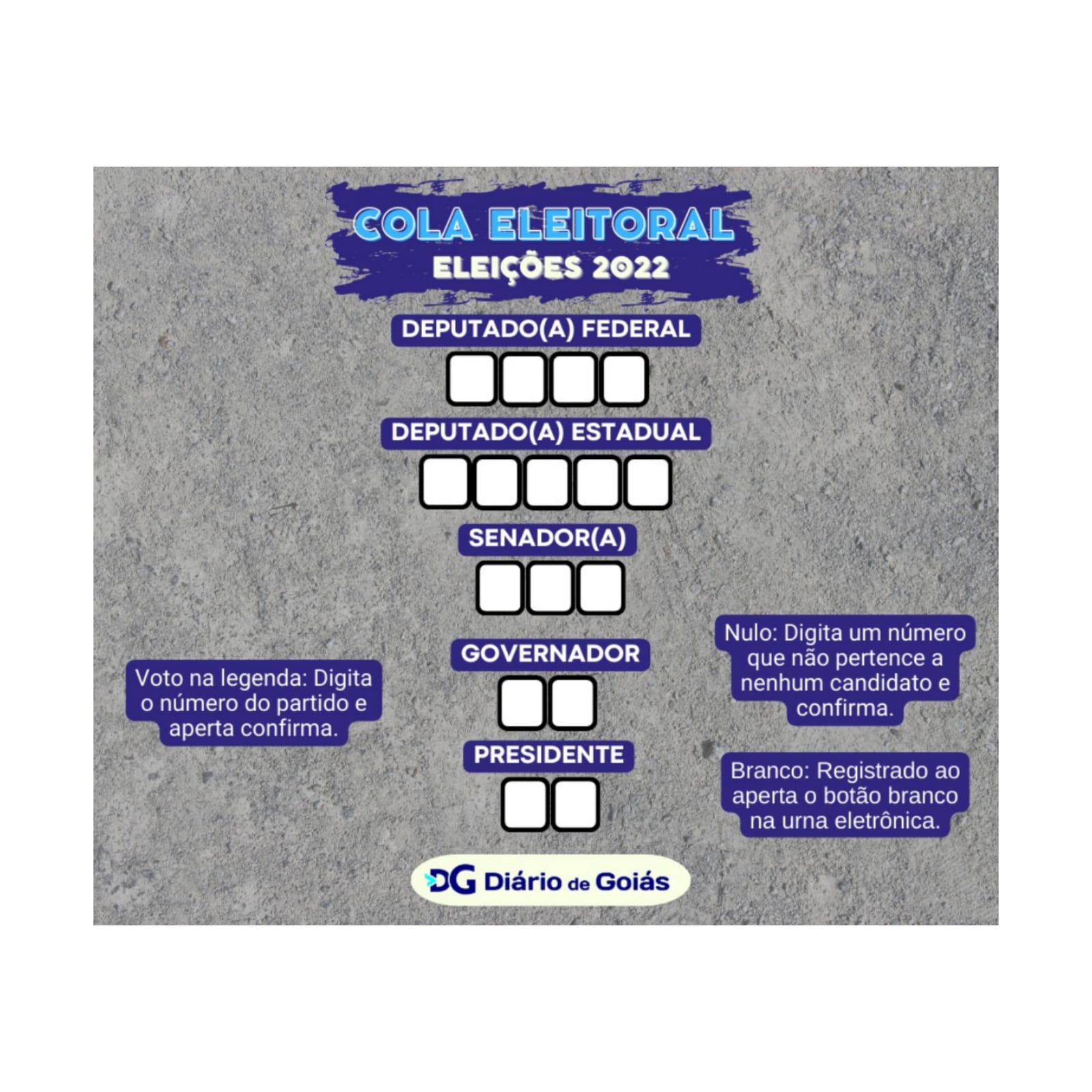 No dia da votação, o Tribunal Superior Eleitoral (TSE) permite ao eleitor levar uma cola para não errar. O Diário de Goiás preparou uma arte para ajudar. Confira abaixo: