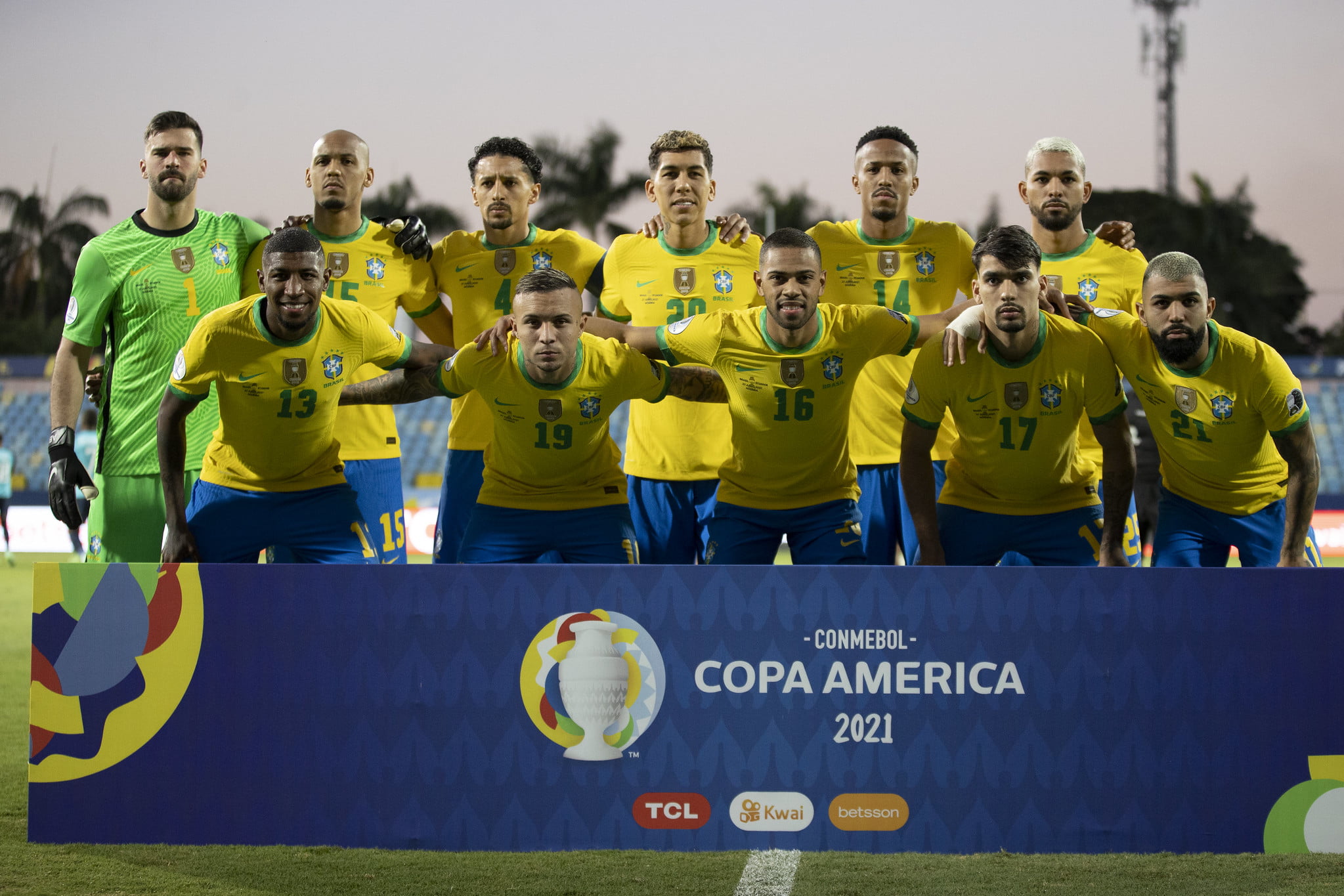 BRASIL – Alisson; Emerson, Éder Militão, Marquinhos e Renan Lodi (Danilo); Fabinho, Douglas Luiz (Casemiro), Everton (Richarlison) e Lucas Paquetá (Everton Ribeiro; Firmino (Vinicius Jr.) e Gabigol. Técnico: Tite.