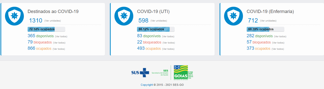 No Estado são 598 unidades de UTI para tratamento da Covid-19, sendo que 494 se encontram ocupadas e 83 disponíveis nos municípios de Catalão (2), Formosa (1), Goiânia (10), Goiás (1), Itumbiara (13), Jataí (6), Luziânia (10), Mineiros (1), Nerópolis (2), Porangatu (3), Rio Verde (3) e Uruaçu (31).