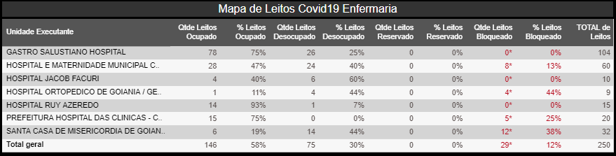 Nas enfermarias, a ocupação é de 72,14% em Goiás, com 365 leitos desocupados de um total de 1.310. Outros 867 estão ocupados e 78 bloqueados. Já em Goiânia, este índice é de 58%, com 75 leitos desocupados na rede municipal. Das 250 unidades para tratamento da Covid-19, 146 estão ocupadas e 29 bloqueadas.
