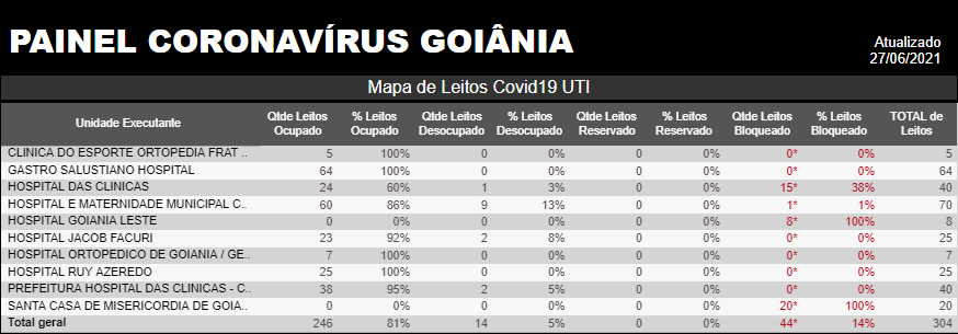 Em Goiânia esta taxa, que na última segunda-feira (21) estava em 79%, neste domingo está em 81% na rede pública municipal, de acordo com o painel coronavírus disponibilizado pela Prefeitura de Goiânia. Dos 304 leitos, 246 estão ocupados e apenas 14 desocupados. Há ainda 44 bloqueios.